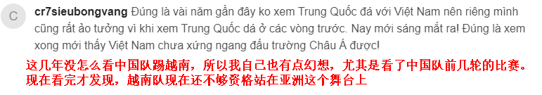 还有球迷妄自菲薄地表示,以前没怎么看过中国队的比赛,但现在看完才发现,越南队现在还不够资格站在亚洲这个舞台上(下图)。